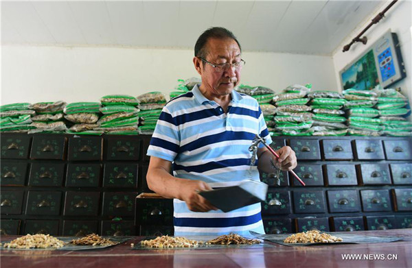 Yue Ruhua selects medicine for patients at Dakouqin village of Houtuanshan town in Jilin city, Northeast China's Jilin province, July 31, 2017. [Photo/Xinhua]