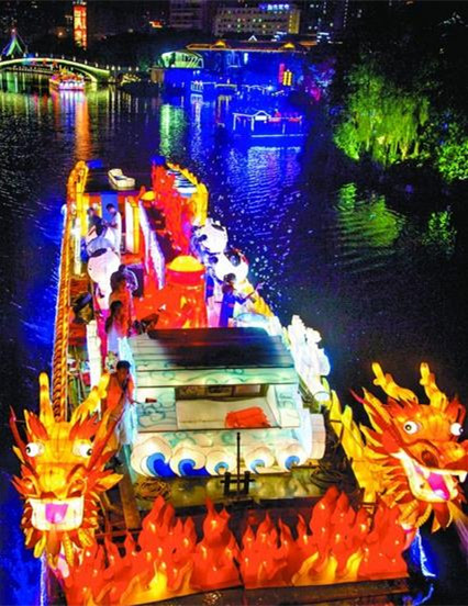 | A stunning dragon boat of light and color cruises along the ancient canal in last year’s tour festival. [Photo/ wxrb.com] |