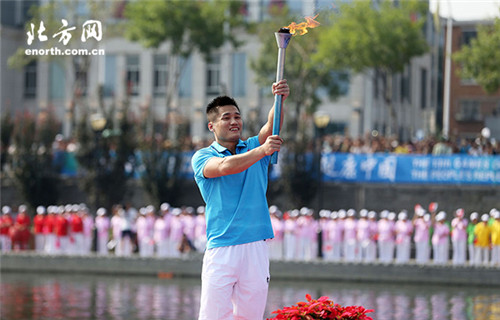 | Lyu Xiaojun, weightlifting champion of the 2012 London Olympics, carries the torch.[Photo/ enorth.com.cn] |