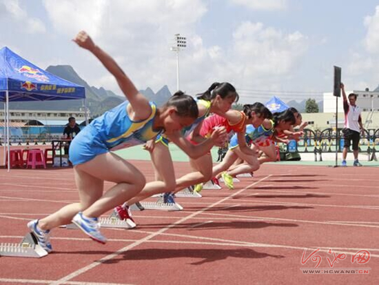 | Young runners sprint off the mark at a track meet in Huanjiang Maonan ethnic county, Hechi, Aug 7. [Photo/hcwang.cn] |