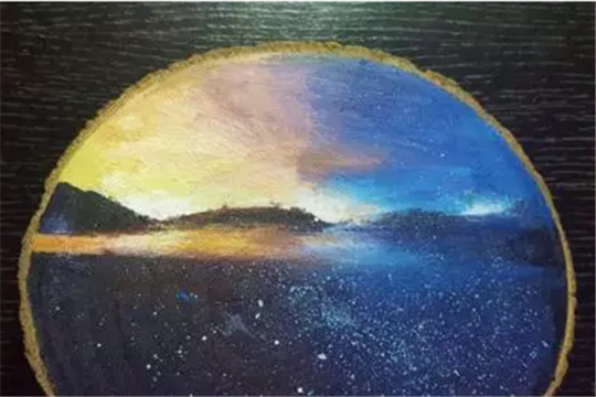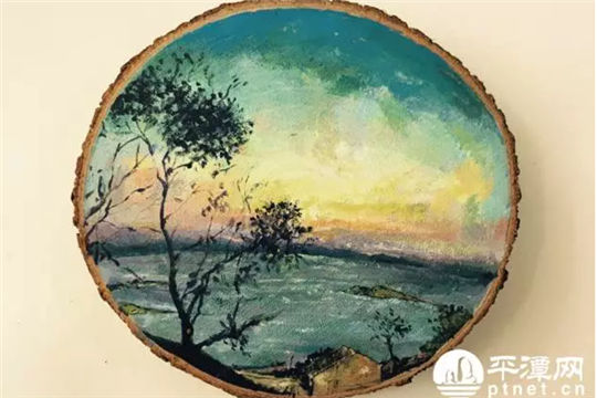 | A painting of a sunset over the Pingtan coastline is painted directly onto a piece of waste wood. [Photo provided to chinadaily.com.cn] |