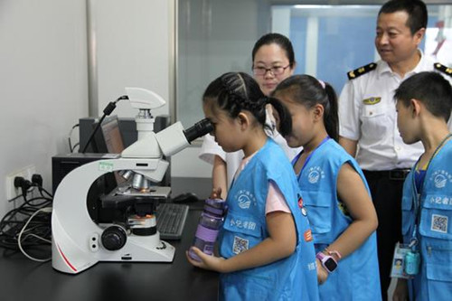 A student watches nematodes and bacteria through a microscope at a science class at the Sanmenxia Entry and Exit Inspection and Quarantine Bureau, Aug 10. [Photo/Sanmenxia Daily]