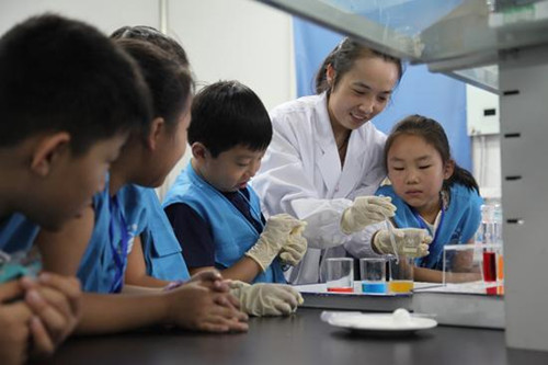Pupils watch a quarantine officer conduct an experiment. [Photo/Sanmenxia Daily]