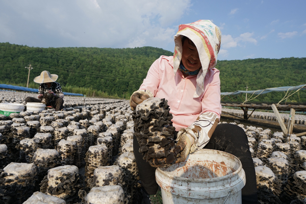| A worker picks edible fungi at a nature reserve in Wangqing. [Photo by Zhang Zefeng/China Daily] |