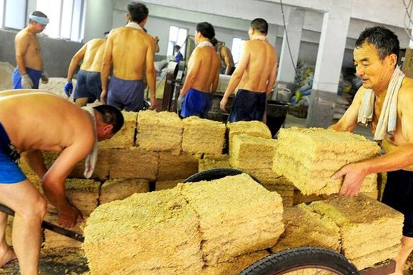 Mixed up with some water, smashed wheat is pressed into bricks to make "jiuqu". The mixture is then used in the fermentation process to make wine. [Photo/ wxrb.com]