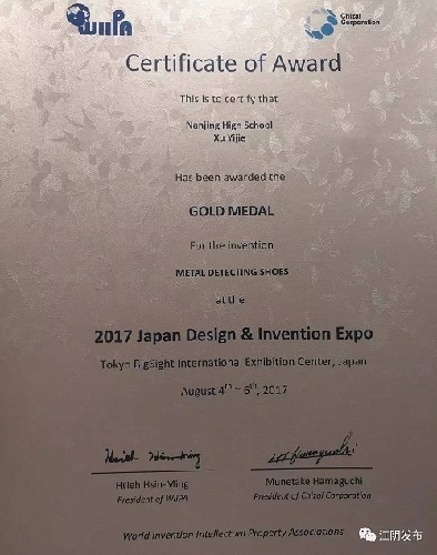 A high school student from Wuxi won the gold medal at a prestigious international design expo held in Tokyo on Aug 6, after impressing the judges with his ingenious idea for a pair of internet of things-powered metal detecting shoes.