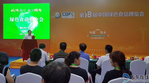 | An official delivers a speech at an organic food promotional event organized by Yantai municipal government on Aug 19 in Baotou, North China's Inner Mongolia autonomous region. [Photo/jiaodong.net] |