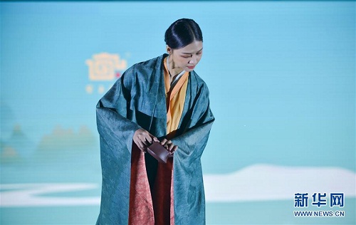 | A model presents a purple clay teapot during the opening ceremony of the Yixing International Ceramic Culture and Art Festival in Beijing on Aug 18. [Photo/ provided to chinadaily.com.cn] |