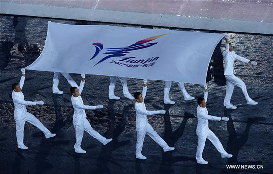 The flag of the 13th Chinese National Games is carried to the stadium during the opening ceremony of the 13th Chinese National Games in North China's Tianjin municipality, Aug 27, 2017. [Photo/Xinhua]