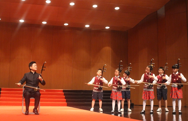 Deng Jiandong, a famous erhu player, performs a light melody with his students at the concert hall of Wuxi Radio & TV Station on Aug 26, 2017. [Photo provided to chinadaily.com.cn]