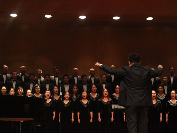 | Lu Jia, a famous conductor and music and art director of the National Centre for the Performing Arts, conducts a chorus of Thinking of You (Ming Yue Ji Shi You in Chinese), a song adapted from the poem written by Su Shi, a poet from the Song Dynasty (420-479).[Photo provided to chinadaily.com.cn] |