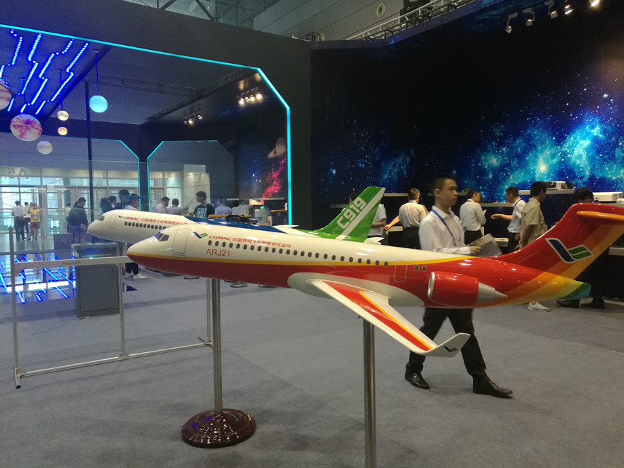 Models of the C919, China's first nationally-produced large passenger plane, and ARJ21, China's first domestic regional jet, are on display in Wuxi on Aug 26-27. [Photo/chinadaily.com.cn]
