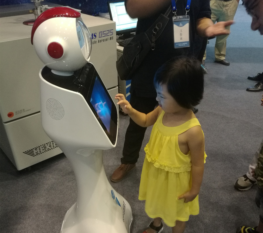 A child touches the screen of a robot which provides inquiry services for the public at the exhibition on Aug 26-27. [Photo/chinadaily.com.cn]