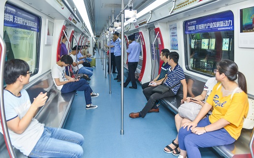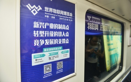 A metro train is decorated with posters promoting the upcoming 2017 World Internet of Things Expo in Wuxi. [Photo/wxrb.com]