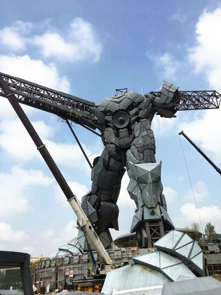 | A 50-meter transformer-style statue stands in Shuanglong Science Fiction Valley in Guiyang, capital of Guizhou province. [Photo provided to chinadaily.com.cn] |