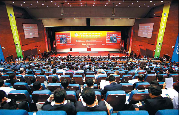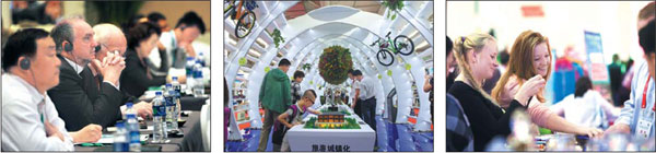 | From left to right: Participants listen at a high-level forum on Northeast Asian cooperation, held during a China-Northeast Asia Expo. One of the nine pavilions of the expo explores the themes of culture and tourism. Foreign visitors check out goods displayed at a previous expo.[Photos provided to China Daily] |