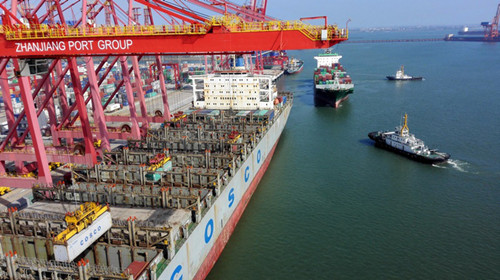 | A container ship is unloaded at Zhanjiang port.[Photo courtesy zjport.com] |