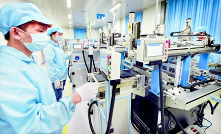 | Staff members work on an intelligent production line in the Guiyang Hi-Tech Industrial Development Area. [Photo/Guizhou Daily] |