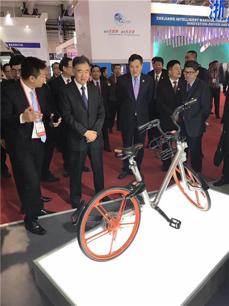 China's Vice-Premier Wang Yang visits the Mobike booth in the Intelligent Manufacturing Pavilion of the 11th China-Northeast Asia Expo.[Photo provided to chinadaily.com.cn]