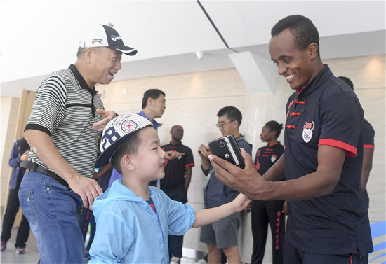 On Aug 30, an African martial arts fan from Tianjin Huoyuanjia school talks with a child after the martial arts competition.[Photo/Xinhua]