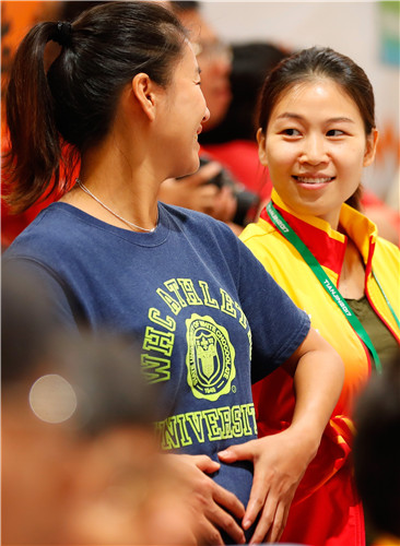 On Aug 31, Yi Siling(R), a world shooting champion, and Liu Hong(L), a famous race-walker and Olympics world-record-holder for the 20km distance, both of them pregnant, watch the final competition in the women’s 10m air rifle event. [Photo/Xinhua]