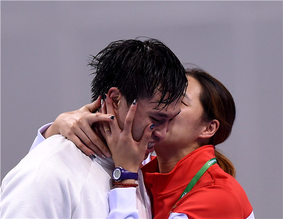 On Aug 30, Zhang Chengjie (L) won gold in the men's epee competition. After the competition, his wife and teammate Hou Yingming (R) gives him a kiss. [Photo/Xinhua]