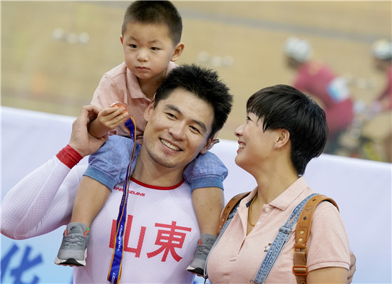 On Aug 30, after the cycling competition, Cheng Changsong, an athlete from Shandong province, shares the joy of winning a bronze medal with his family.[Photo/Xinhua]