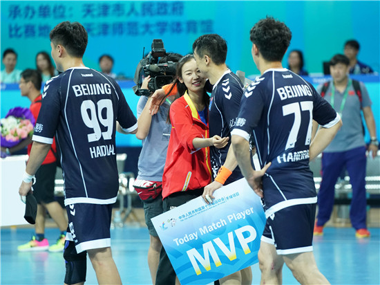 On Aug 28, Zhang Ji, a player from the Beijing handball team, is greeted by his wife after the competition. [Photo/Xinhua]