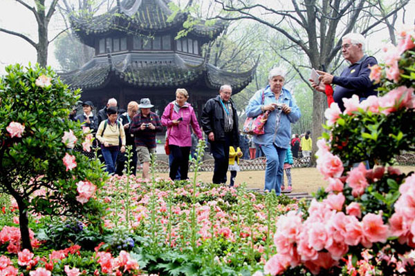 Foreigners visit a classic garden in Suzhou, Jiangsu province, on April 6, 2017. [Photo/Asianewsphoto]