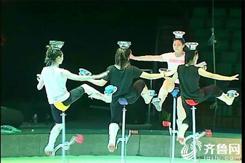 | Acrobats balance bowls on their heads and feet during a rehearsal in Penglai's Euro Park International Circus Theatre. [Photo/yantai.iqilu.com] |