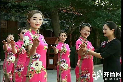 | Volunteers dressed in qipao, a traditional Chinese dress, take part in an etiquette training session in Penglai, East China's Shandong province. [Photo/yantai.iqilu.com] |