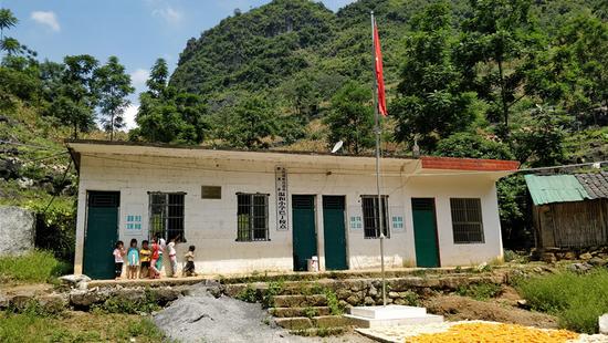 Students stand outside the Bading teaching spot in Dahua Yao autonomous county. [Photo by Nong Guanbin/Xinhua News Agency]