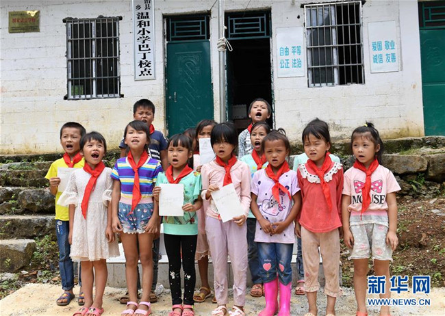 Young students at the Bading area in Yalong town, Dahua Yao autonomous county, Guangxi, pay tribute to their former teacher on Sept 7. [Photo by Zhou Hua/Xinhua News Agency]