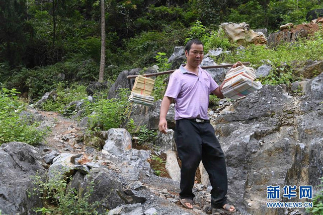 Wei Zhijie, a teacher from Wenhe village who has taken over Meng Zhinian's teaching post in Bading, walks to the school on Sept 7. [Photo by Zhou Hua/Xinhua News Agency]