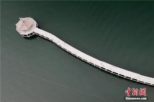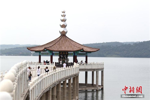 | A bird's-eye view of the Longwang Pavilion in Nanyang's Danjiangkou Reservoir scenic area on Sept 16, 2017 [Photo/chinanews.com] |