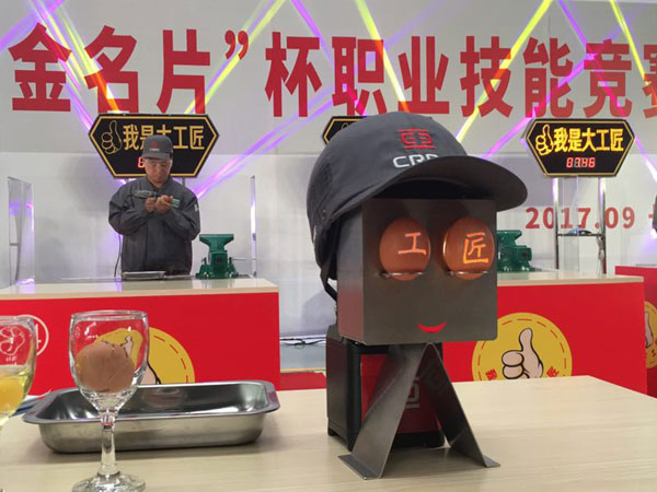 A competitor carves Chinese characters "Gong Jiang" on an egg shell without breaking it in a vocational skills competition at CRRC Changchun Railway Vehicles Co, Ltd.[Photo by Han Junhong/chinadaily.com.cn]