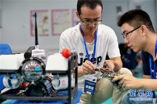 Students from Yanshan University debug their "Sea-air cross-media communication underwater robot". [Photo/Xinhua]