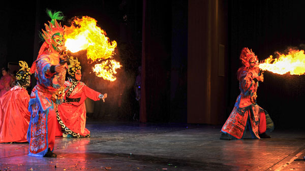Fire-breathers perform at the opening ceremony of the 10th China Acrobatics Golden Chrysanthemum Awards in Penglai, East China's Shandong province, on Sept 16, 2017. [Photo provided to chinadaily.com.cn]