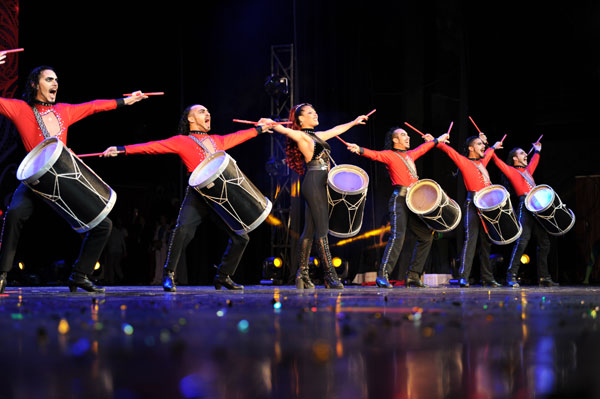 A group of performers stage a drumming performance at the opening ceremony of the 10th China Acrobatics Golden Chrysanthemum Awards in Penglai, East China's Shandong province, on Sept 16, 2017. [Photo provided to chinadaily.com.cn]