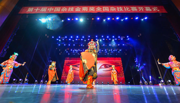 | Actors perform "face-changing", a famous performance art first developed by Sichuan Opera performers, at the opening ceremony of the 10th China Acrobatics Golden Chrysanthemum Awards in Penglai, East China's Shandong province, on Sept 16, 2017. [Photo provided to chinadaily.com.cn] |