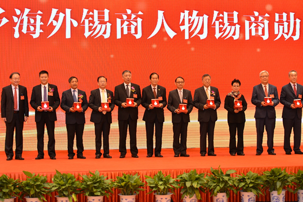 | Ten outstanding overseas businesspeople with ties to Wuxi are awarded at the conference. [Photo by Mao Jiaqing, Xu Ruixing] |