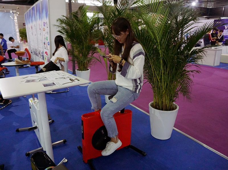 A visitor tries out an E-bike, an exercise bike designed for the workplace, at the 14th China (Wuxi) International Design Expo in Wuxi, East China's Jiangsu province, on Sept 22. More than 10,000 designs from countries including Germany, France, Denmark and Japan are currently on display. [Photo provided to China Daily]