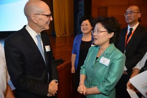 | Zhang Yongxia, mayor of Yantai, meets with AmCham China Chairman William Zarit and briefs him on Yantai's investment environment, key industries and favorable policies at a forum in Jinan, Shandong province on Sept 20. [Photo/WeChat account: yt6666001] |
