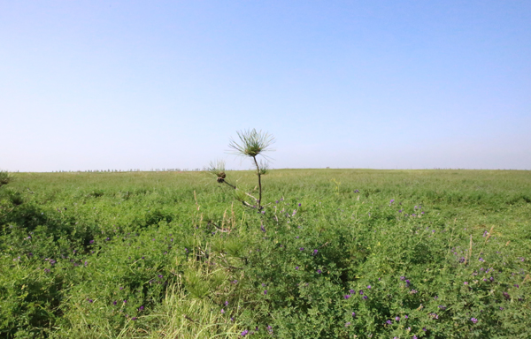 A vast land of alfalfa grows and blossoms on the flat top area of the reclaimed hill. [Photo by Song Tingting/chinadaily.com.cn]