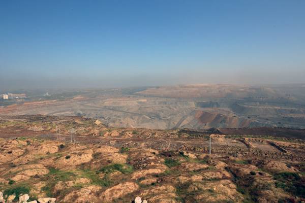 Machines still disturb the soil to dig coal in the open pit while the grass starts to sprout from newly reclaimed land close by. [Photo by Song Tingting/chinadaily.com.cn]