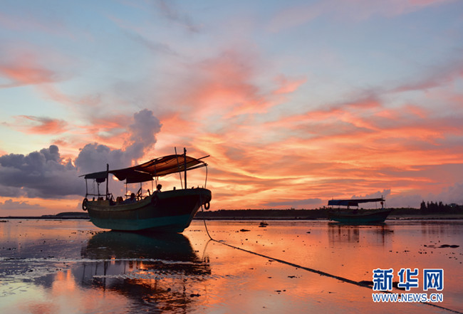 A sunset slowly recedes in the sky over Piliao Bay in Donghai Island, Zhanjiang, its grey and golden hues melting the last remnants of the day. [Photo by Weng Wen/www.news.cn]