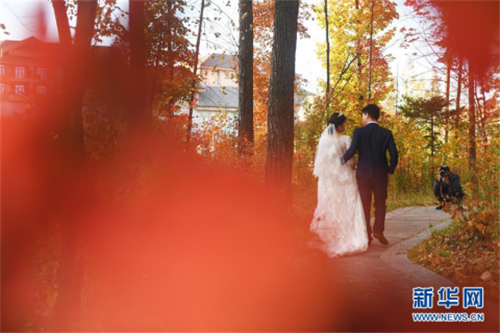 A couple's wedding photos are taken at Changbai Mountain. [Photo/ Xinhua] |