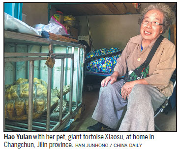 Hao, an 83-year-old grandmother who lives in Changchun, Jilin province, became well-known after local media reported her taking her pet giant tortoise Xiaosu out for a walk.