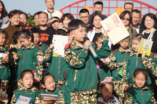 A child introduces the book he donated, Sept 23. Approximately 200 books were collected on the day. All of the books were placed on the bookshelves set up in the park. Residents can borrow the books from the bookshelf free of charge. [Photo/wenming.cn]