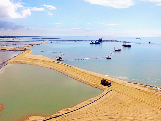 Construction of the cargo-passenger ro-ro terminal of Xuwen Port is 35 percent finished. [Photo by Liu Jicheng/Zhanjiang Daily]